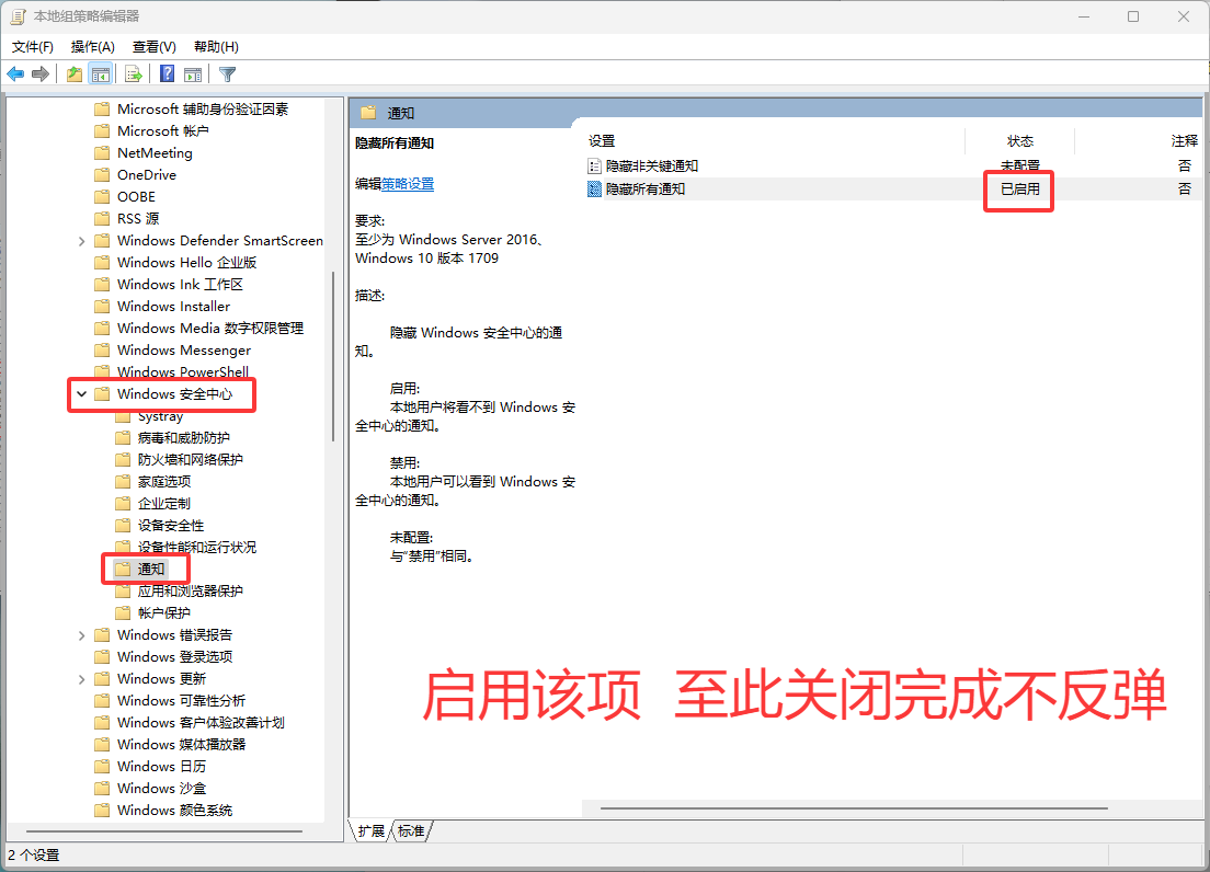 接着点击“管理模板/Windows组件/Windows安全中心/通知”进行以下一项操作